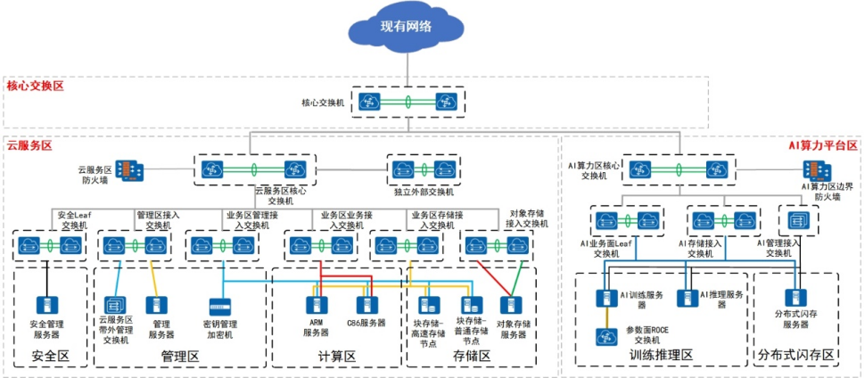 方案设计:根据需求分析结果,设计定制化的云数据中心基础设施建设方案。涵盖计算基础设施、存储基础设施、网络基础设施、安全基础设施、电力基础设施、制冷基础设施、机房设施、管理与监控系统等各个子系统的架构设计,确保各部分协同工作,满足用户长期发展需求。
