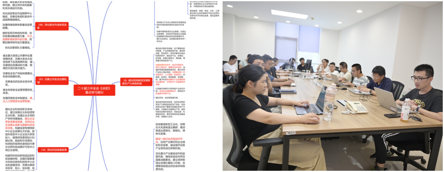 第九党支部第一小组重点学习了“注重构建支持全面创新体制机制”,党员同志们纷纷表示深刻体会了坚持守正创新的重要性,坚持守正创新,是我们在新时代推进各项事业发展的根本要求。在软件研发过程中,在保证基本原则和规律的基础上,要勇于探索新的技术、方法和业务模式,推出更好的产品服务更多的团队,以满足不断变化的市场需求,为民族软件的进步贡献力量。第九党支部第二小组通过学习《党的二十届三中全会 一图读懂》,观看《学习贯彻党的二十届三中全会精神系列专访|深刻领会进一步全面深化改革的主题》带领党员同志们深入学习会议精神,加强了对全面深化改革的理解,使党员同志们把握会议的核心要义和实践要求,从而在各自的工作岗位上更好地落实党的方针政策,推动各项工作的高质量发展。
