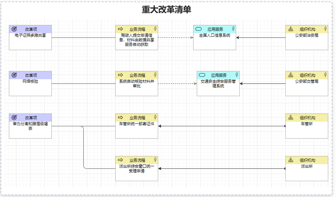 将再造流程中的创新点关联到涉及的应用系统以及主管部门,即可形成完整的改革项,最终作为梳理重大改革清单的素材。