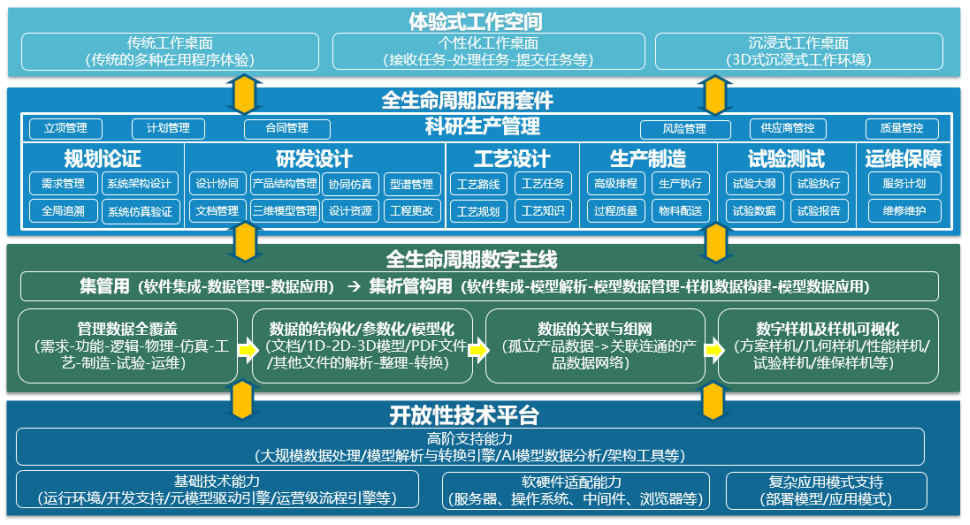 全生命周期数字主线是PLM系统本源功能的固化和深化,效果体现为按照业务流程要求,将正确的数据在正确的时间递送给正确的消费者,完成从数据提供方到消费者(包含人员、工具软件、应用系统、设备等)的安全、高效递送。全周期数字主线包括以下关键能力,一是管理全生命周期数据,构成PLM系统的数据基础。二是全生命周期数据的结构化、参数化和模型化处理。三是通过模型数据的网络化管理,将数据从“孤立状态”连接为“连通状态”,形成经纬相通的数据网络。四是模型数据的业务赋能,即通过管控流程、技术流程和协同流程,为业务提供数据服务,并与可视化技术和工具深度融合,构成3D为主的直观、模型驱动的产品研制协同环境。