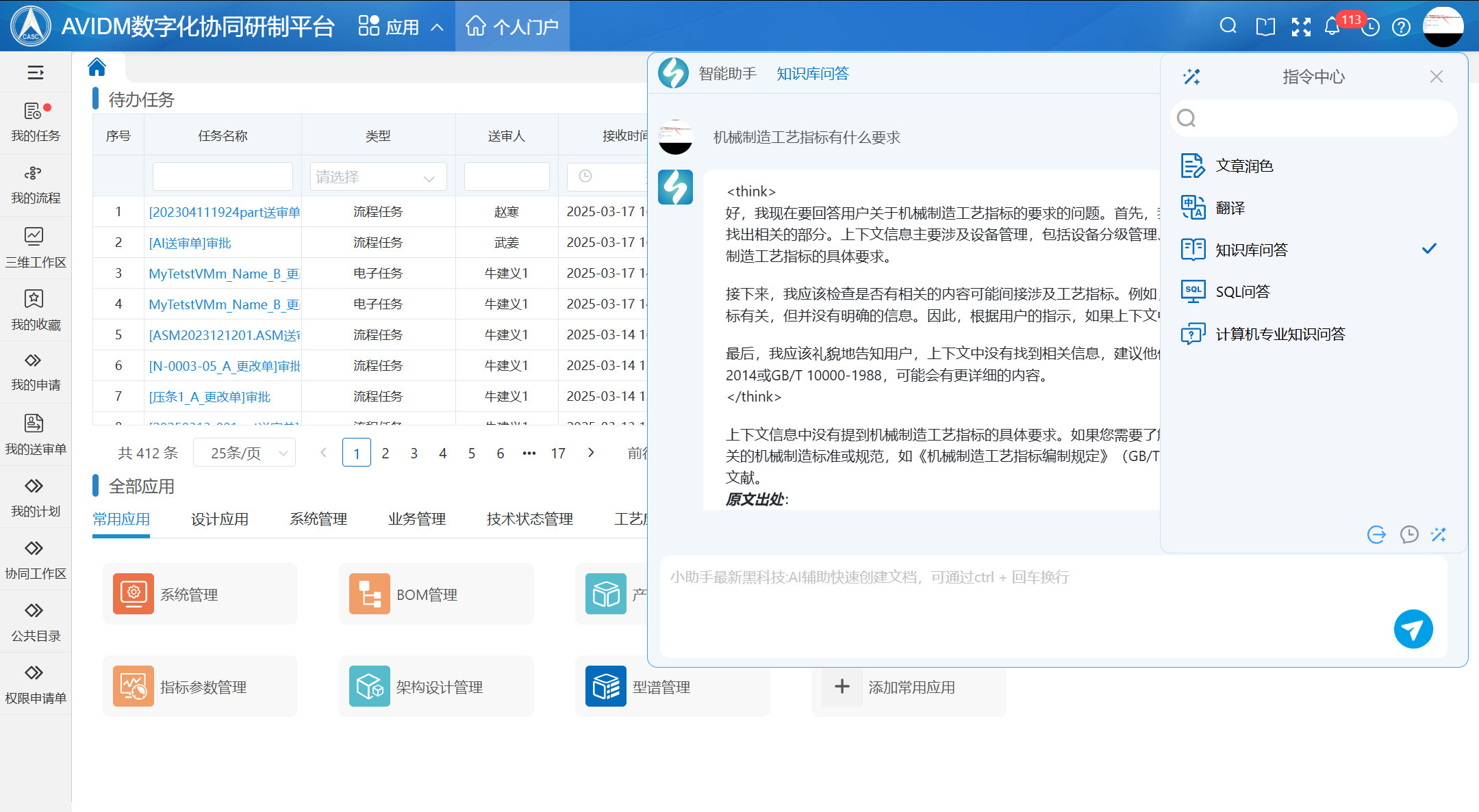 AVPLM系统已具备科研生产智能问答、文档智能生成、文档智能审查、工艺智能生成等智能化场景应用能力。