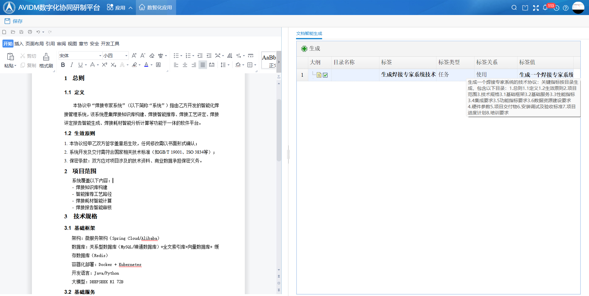通过解析文档模板与设计要求中的关键指标和关键词,调用DeepSeek大模型进行语义分析,可结合科研生产的项目管理、体系论证、系统设计、工艺设计、生产制造、试验验证和运维保障业务要求,基于历史文档库的相似案例匹配,一键生成符合规范的技术文档。