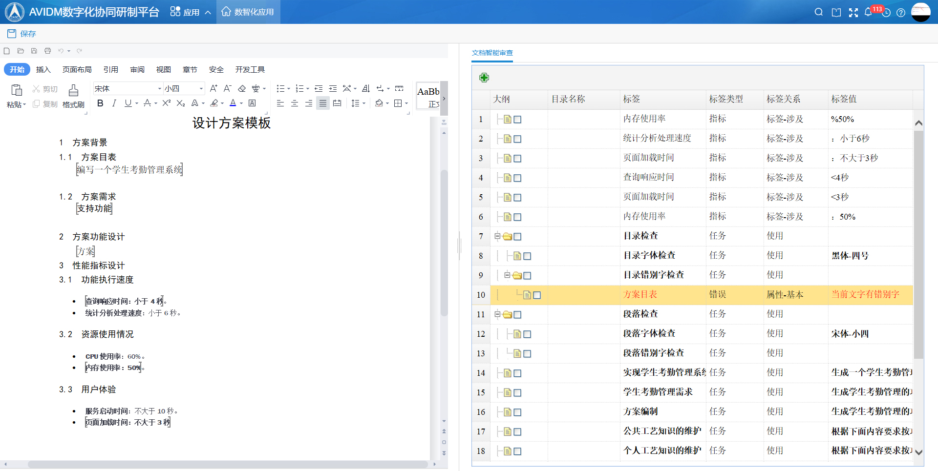 调用DeepSeek大模型的指标抽取与分析能力, 通过在系统中内置合规性规则库(如结构设计文件检查规则、工艺设计文件检查规则等),以及各种文档模板的格式规范性要求,自动检查文档的格式规范性、内容完整性和逻辑矛盾,支持多文件关联审核。